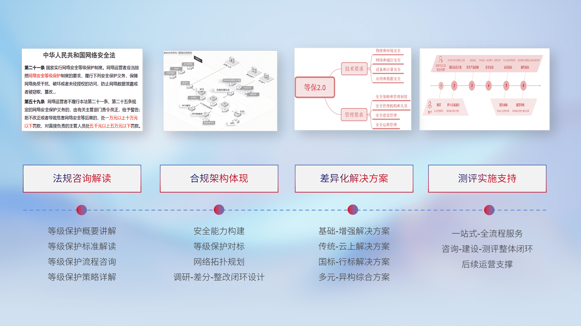 通过专业的法律咨询解读、、、合规架构体现、、、差异化解决方案、、、测试实施支持等服务,,为客户量身打造等保合规体系。。。